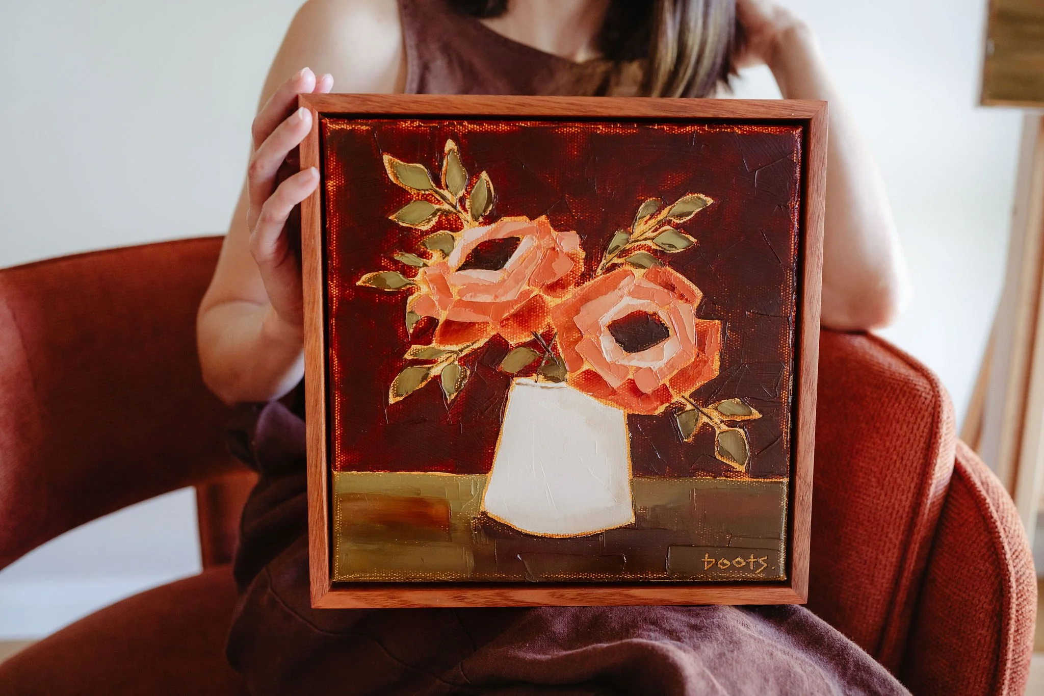 Working from her home-based studio, lovingly referred to as the “Bootio” (Boots + studio), Chloe creates expressive, textured, floral artworks that radiate bold, feminine energy. Working mostly with a palette knife and earthy tones, her paintings are inspired by nature and life’s simple moments, inviting viewers to pause and appreciate the beauty in the everyday.
